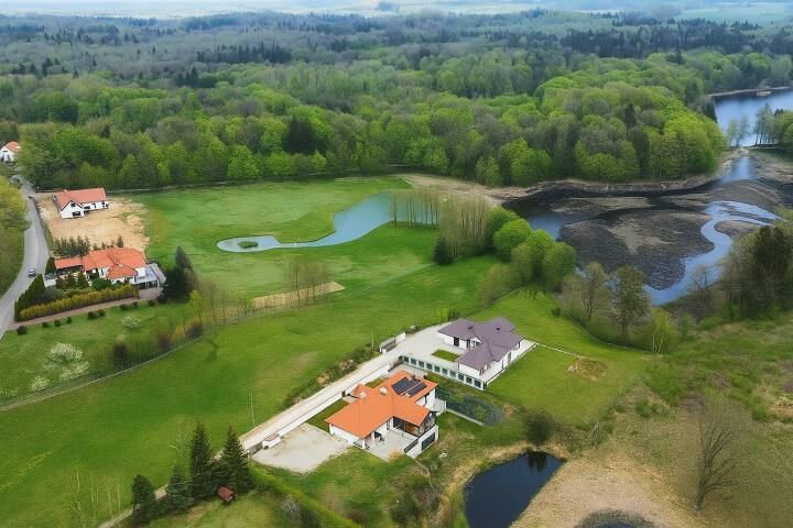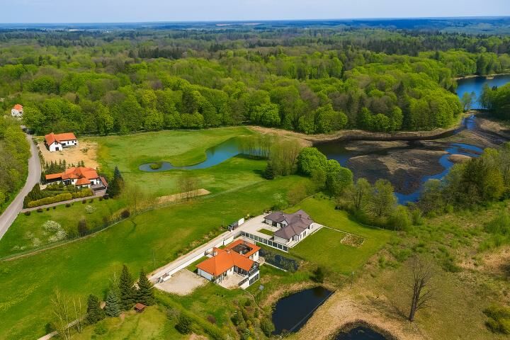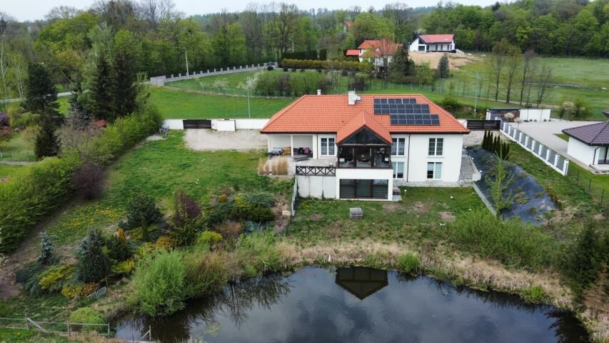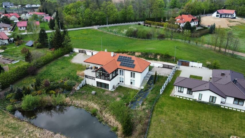 Reprezentacyjny dom w stylu dworkowym, z dużym tarasem i przeszklonym ogrodem zimowym Widok na prywatny staw o powierzchni ponad 400 m